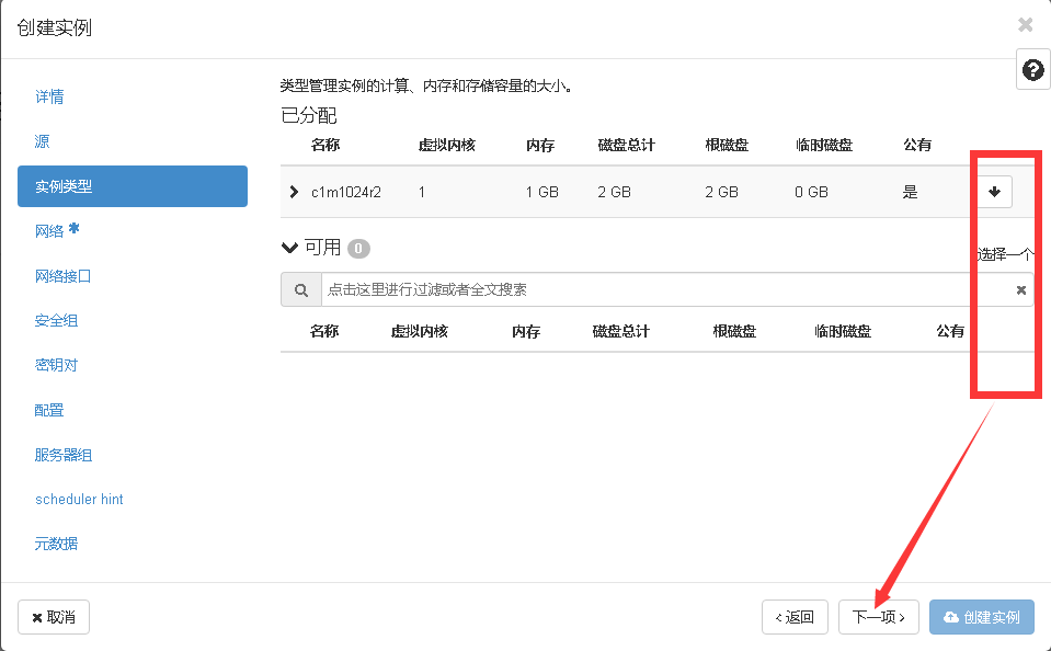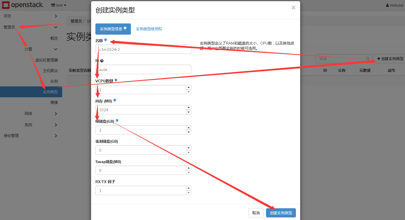 创建一个新的实例类型,在创建实例时选择不同的实例类型分配设置好的资源大小,管理员-->计算-->实例类型-->创建实例类型-->填写名称、VCPU数量、内存和根磁盘-->创建实例类型。注意:设置的VCPU数量、内存和根磁盘必须小于物理机剩余资源。