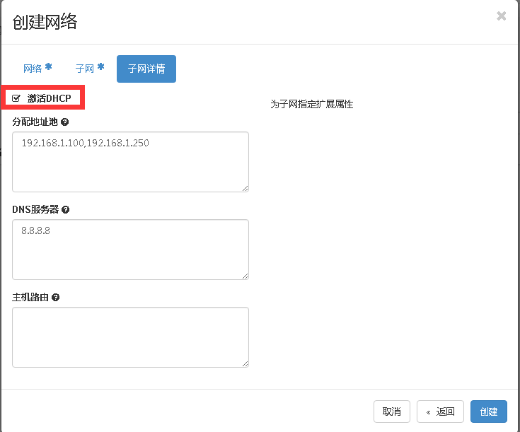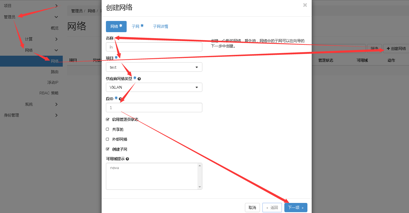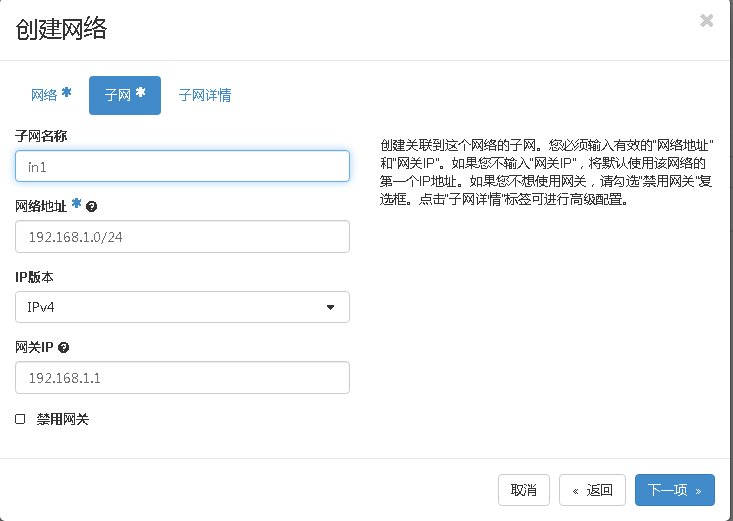 创建内网in,管理员-->网络-->网络-->创建网络-->填写名称,选择项目和供应商网络类型,填写段ID-->当创建子网被选中时,点击下一项进入创建子网页面-->填写子网相关信息,点击下一项-->选中激活DHCP,填写相关信息,点击创建。