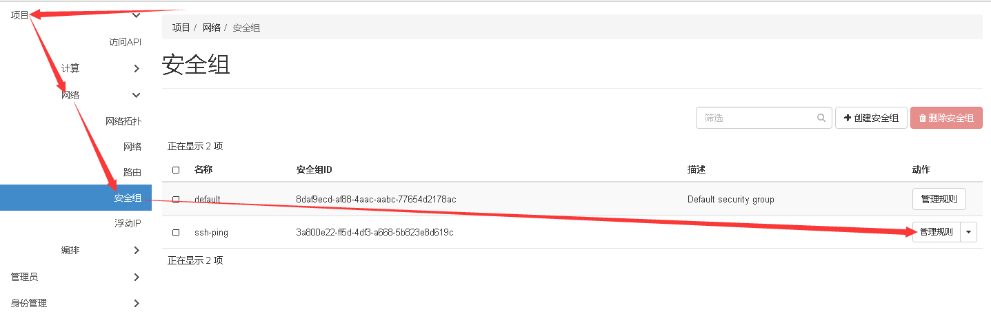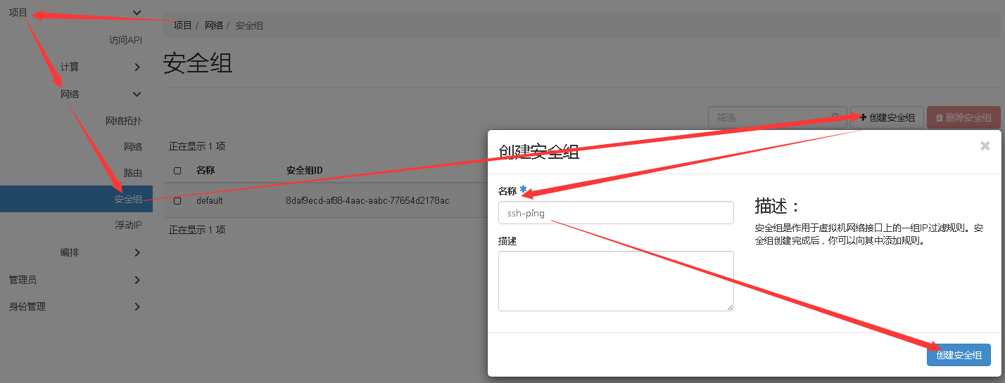 创建名为ssh-ping的安全组,项目-->网络-->安全组-->创建安全组-->填写名称-->创建安全组。