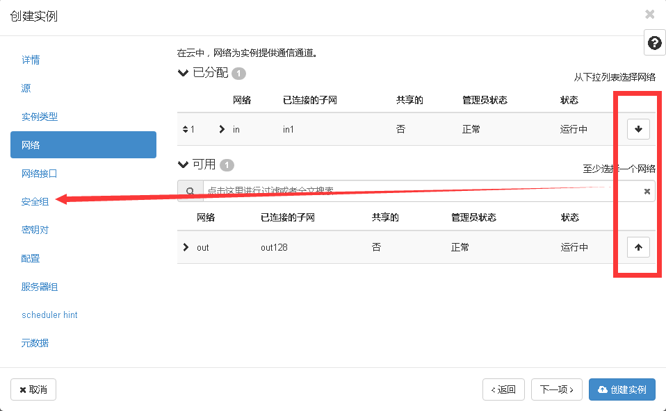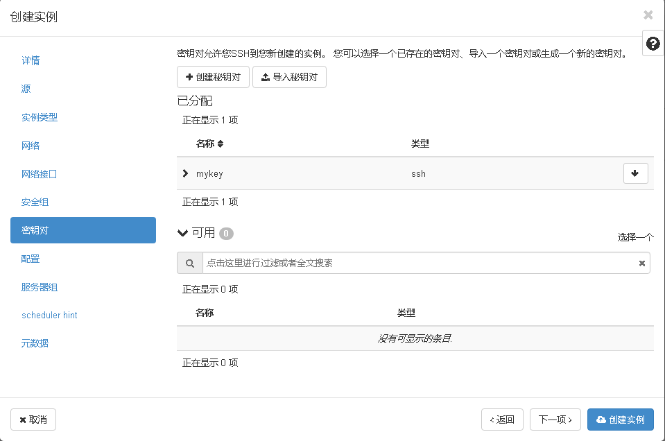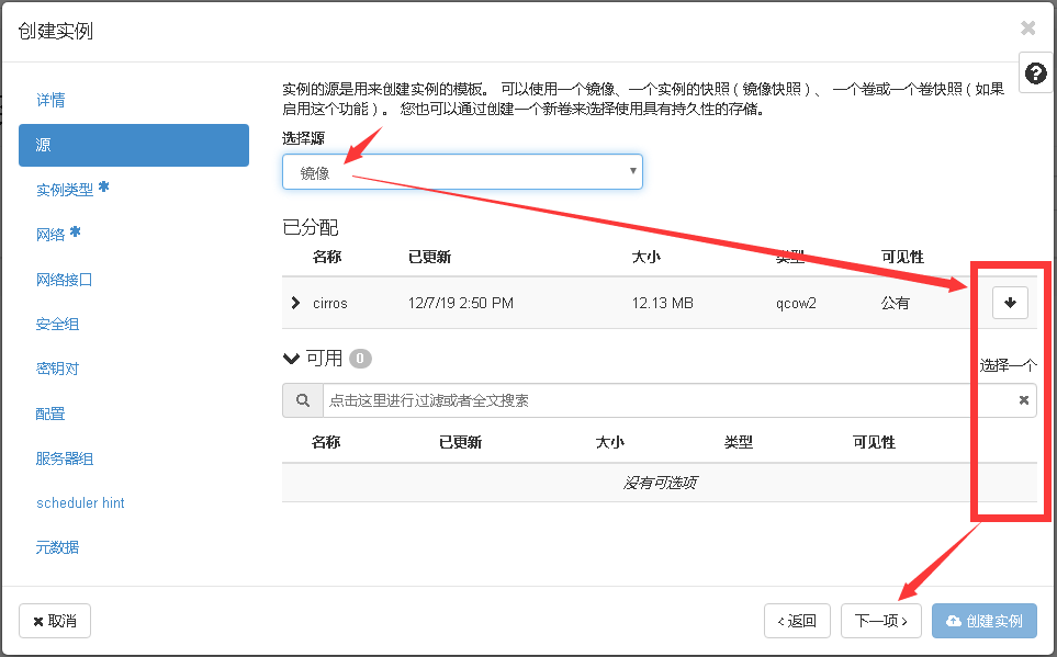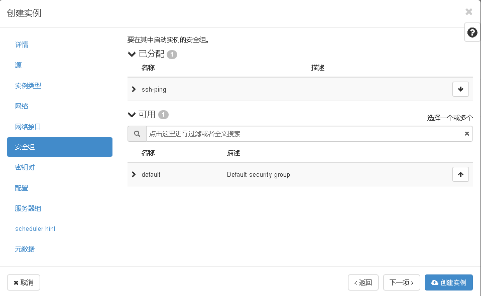 准备工作全部完成后终于可以创建实例了,项目-->计算-->实例-->创建实例-->填写实例名称和数量-->点击下一项,进入源页面-->选择源,将其中一个移动到上方-->点击下一项,进入实例类型页面-->将其中一个实例类型移动到上方-->点击下一项,进入网络页面-->选择内网-->网络接口默认即可,直接跳到安全组-->调整安全组、密钥对和其他配置-->创建实例