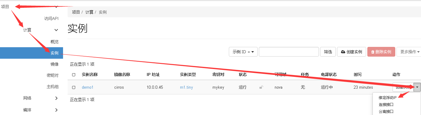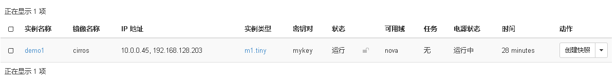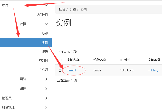 在以上没有错误的情况下,此时就可以到Web页面看到名为demo1的实例了(项目-->计算-->实例)。如下: