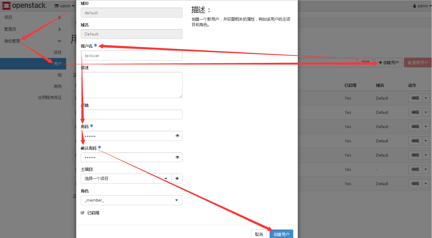 创建一个名为testuser的用户,身份管理-->用户-->创建用户-->填写用户名和密码-->创建用户