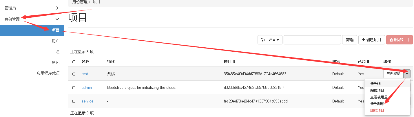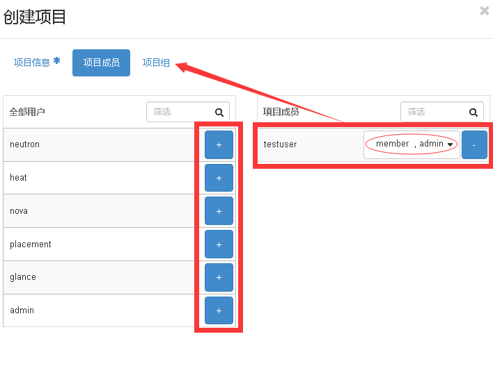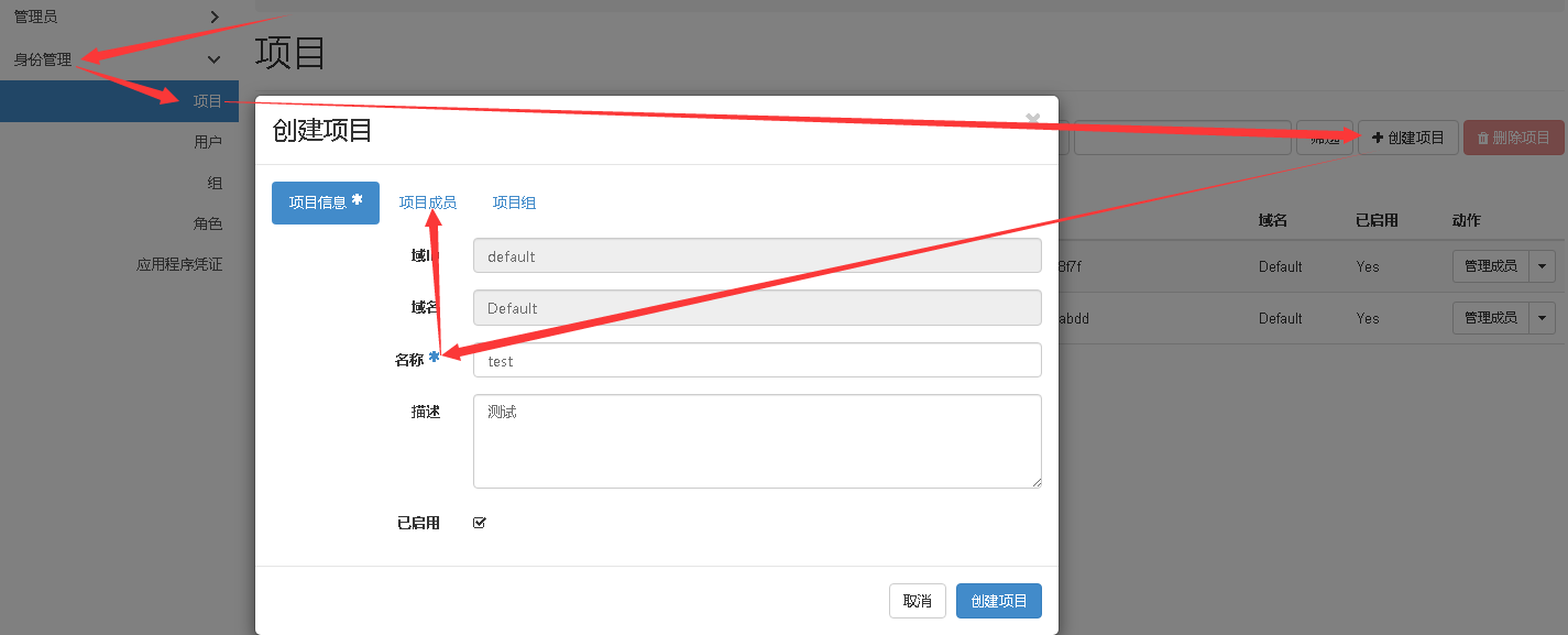 创建一个名为test的项目,身份管理-->项目-->创建项目-->填写项目名称-->转到项目成员-->通过左侧的加号将testuser加入右边,并选择成员的角色-->创建项目。项目组类似用户组的作用,根据需求使用。