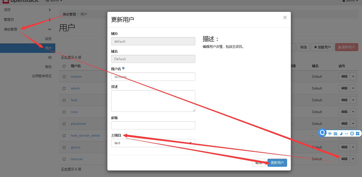 另外,还可以回到身份管理-->用户-->testuser的编辑-->将test项目作为testuser的主项目