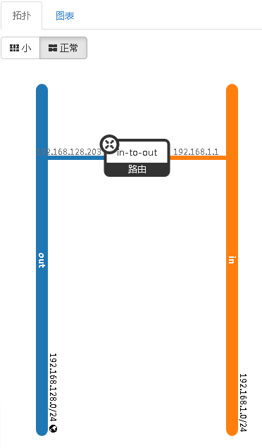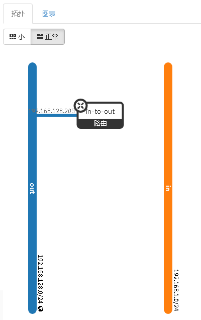 此时虚拟路由与out网络连接,但还没有与in网络连接,可以在网络拓扑中明显看出
