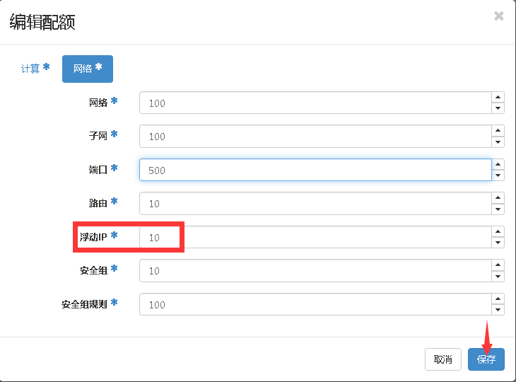查看项目的配额,根据需求修改。身份管理-->项目-->修改配额-->编辑计算里的实例、VCPU数量和内存(物理机CPU4核,内存16G)-->转到网络-->修改浮动IP-->保存。