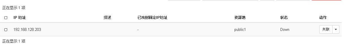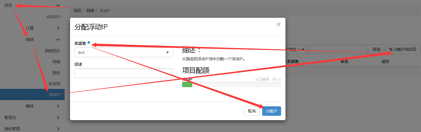 准备一个浮动IP(外网IP),项目-->网络-->浮动IP-->分配IP给项目-->选择资源池-->分配IP