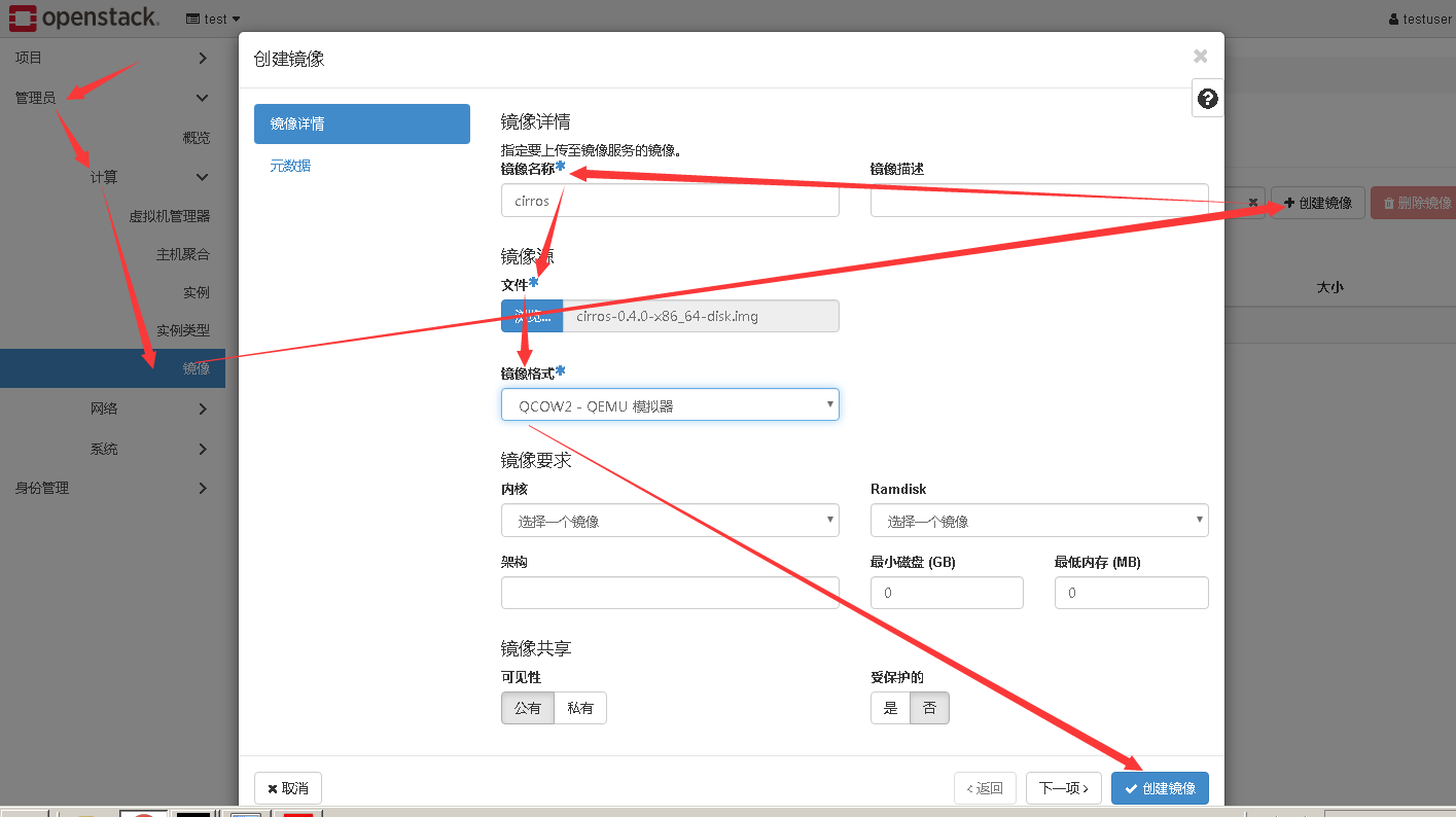 这里以cirros镜像作为例子,下载地址Index of /0.4.0,下载cirros-0.4.0-[系统架构]-disk.img。现在完成后通过网页创建镜像,管理员-->计算-->镜像-->创建镜像-->填写镜像名称,选择镜像文件地址,选择镜像格式-->创建镜像,元数据根据需求进行修改。注意:cirros镜像默认格式为qcow2格式