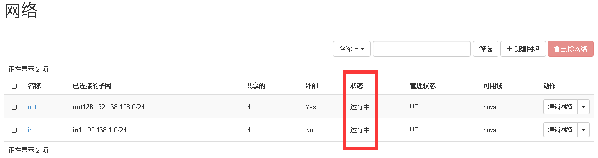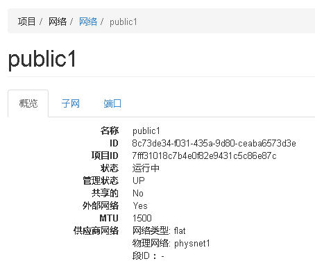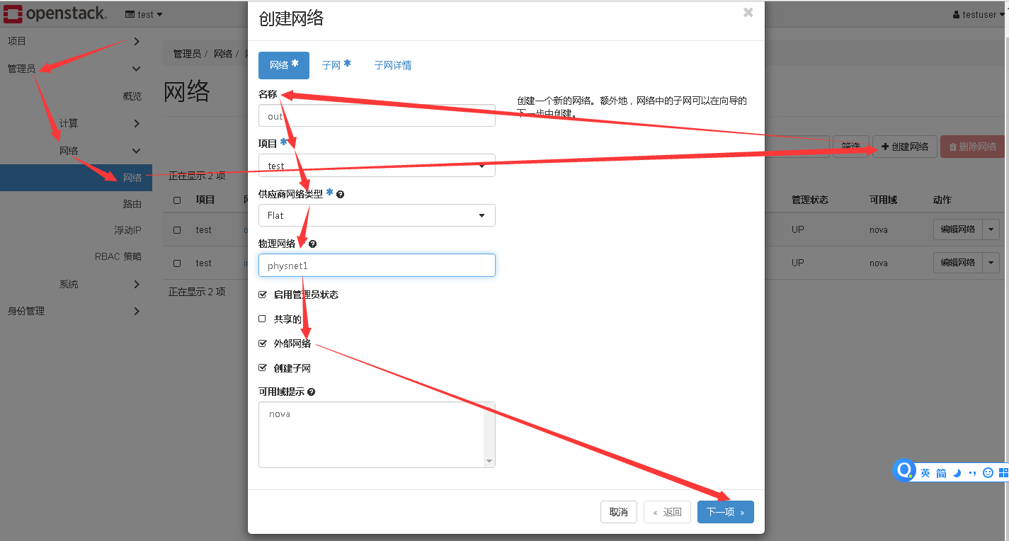 创建外网out,管理员-->网络-->网络-->创建网络-->填写名称,选择项目和供应商网络类型,填写物理网络,勾选外部网络,点击下一项-->填写子网相关信息,点击下一项-->取消激活DHCP,填写相关信息,点击创建。注意:(基于供应商网络为flat下)物理网络需要是ml2_conf.ini文件中的参数“flat_networks = physnet1”,使用kolla安装的请查看/etc/kolla/neutron-openvswitch-agent/ml2_conf.ini,完整安装的请查看/etc/neutron/plugins/ml2/ml2_conf.ini。