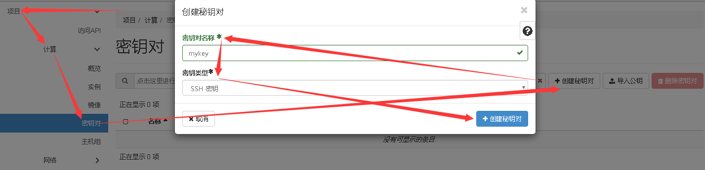 创建一个专属密钥对,项目-->计算-->密钥对-->创建密钥对-->填写密钥对名称,选择密钥类型-->创建密钥对。