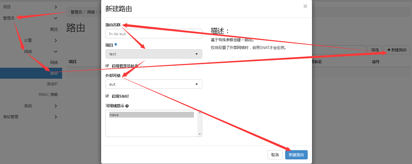 创建一个路由连接内外网络,管理员-->网络-->路由-->创建路由-->填写路由名称、选择项目和外部网络-->新建路由。