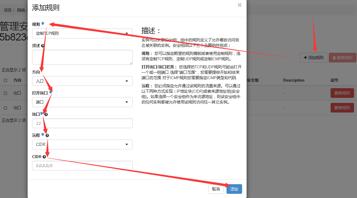 编辑ssh-ping安全组的规则,项目-->网络-->安全组-->管理规则,进入管理规则页面-->添加规则-->填写相关信息-->添加。注意:0.0.0.0/0表示所有IP