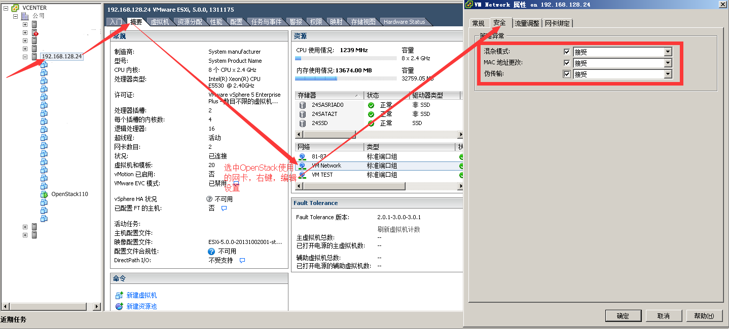 如果OpenStack的宿主机是Exsi创建的虚拟机,则必须进行如下操作,选中OpenStack所在的Esxi系统-->进入摘要-->选中OpenStack宿主机所使用的虚拟网卡-->右键,编辑设置-->选择设置页面的安全-->混杂模式、MAC地址更改、伪传输全部设置为接受。希望后来者不会再被坑了