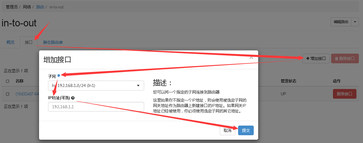 所以现在需要是路由与in网络连接,管理员-->网络-->路由-->点击路由的名称,进入到内部编辑页面-->接口-->添加接口-->选择子网,填写IP地址-->提交