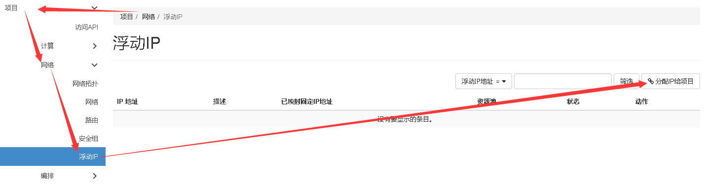 在Web页面中选择:项目-->网络-->浮动IP-->分配IP给项目