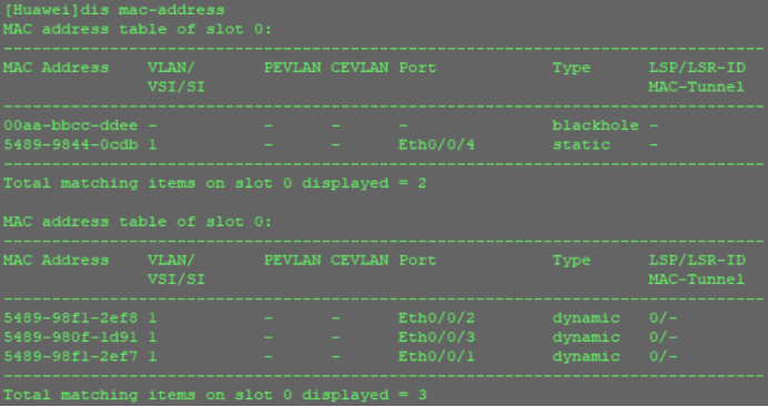 [Huawei]mac-address static 5489-9844-0CDB Ethernet 0/0/4 vlan 1配置黑洞表项: