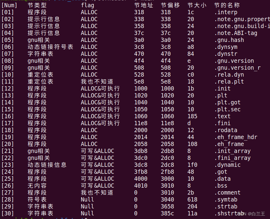 char *flag[8] = {"Null\t\t", "可写\t\t", "ALLOC\t\t", "可写&ALLOC\t", "可执行\t\t", "可写&可执行\t", "ALLOC&可执行\t", "可写&执行&ALLOC\t"};
