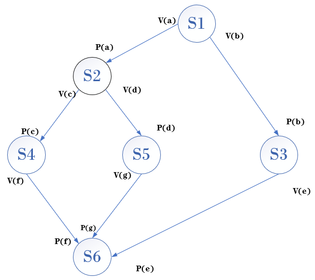 p2() {wait(a); S2; signal(c); signal(d);}