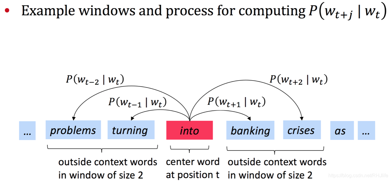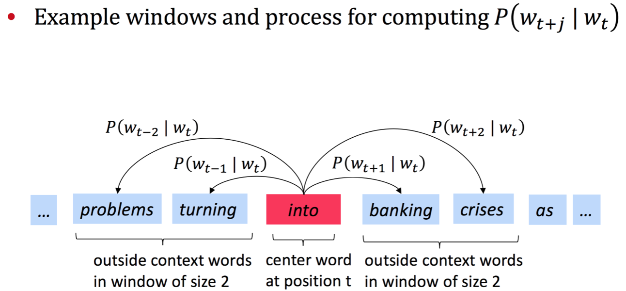 - 遍历一个文本,对于文本中的每个位置t,遍历到的位置t对应的词称为中心词c,中心词的上下文单词成为词o(选择中心词上下m个词作为背景词,m也叫窗口大小,是人为设定的超参数)