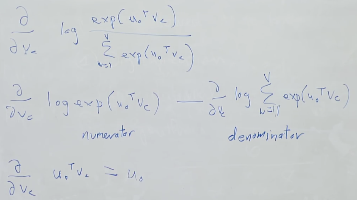 u代表背景词向量,v代表中心词向量。解释一下为什么这么设计,首先橙色部分,为什么是中心词向量和背景词向量的点乘哪?因为点乘对两个向量有表示相似度的含义(具体可以查阅余弦相似度的概念);蓝色部分中V代表所有样本,也就是分母是分子的所有可能的和,为什么分母是对分子的求和?因为这样就可以表示概率了呀~不明白的话,我就这么解释:你抽中红球的概率是不是(红球/所有球之和),就这个意思,单个样本/所有样本就是该样本的概率;为什么用exp来对橙色部分进行处理?因为点乘可能正负,对于概率来说,是不合理的,所以加上exp,则分子一定是正数,分母更不用说了;其实p函数采取的是一种softmax的思想,有兴趣的可以了解下,softmax中的操作其实就是上述解释~