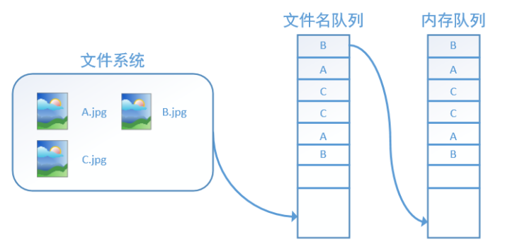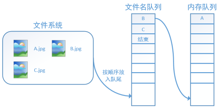程序运行后,内存队列首先读入A(此时A从文件名队列中出队):