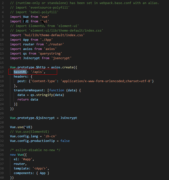- 在main.js中全局配置一个 baseURL,这样就不用挨个修改 url 了,它的作用是作为一个拦截器,当请求地址匹配到这个上下文,就可对请求做代理跨域