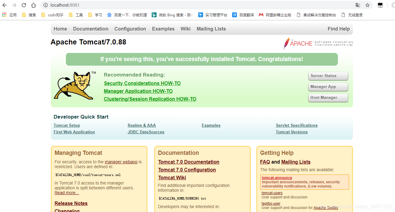 注意:tomcat默认端口为8080 而在上图我输入的是8081 是因为我修改了tomcat的端口号 有需要的朋友可以参考一下我的另外一篇博客Tomcat修改端口号
