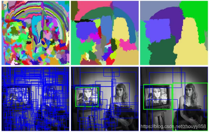 选择性搜索:我们不使用暴力方法,而是用候选区域方法创建目标检测的感兴趣区域(ROI)。我们首先将每个像素作为一组。然后,计算每一组的纹理,并将两个最接近的组结合起来。但是为了避免单个区域吞噬其他区域,我们首先对较小的组进行分组。我们继续合并区域,直到所有区域都结合在一起。下图第一行展示了如何使区域增长,第二行中的蓝色矩形代表合并过程中所有可能的 ROI。