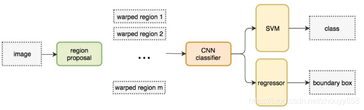 R-CNN 利用候选区域方法创建了约 2000 个 ROI。这些区域被转换为固定大小的图像,并分别馈送到卷积神经网络中。该网络架构后面会跟几个全连接层,以实现目标分类并提炼边界框。