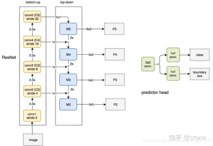 FPN实际上是一种通用架构,可以结合各种骨架网络使用,比如VGG,ResNet等。Mask RCNN文章中使用了ResNNet-FPN网络结构。