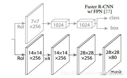 - 头部网络,包括边界框识别(分类和回归)+mask预测。头部结构见下图: