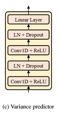 变量预测器有相似的模型结构和FS中的时长预测器。这把隐藏的序列作为输入并且预测了每个音素(时长)的变化,或每一帧(音高和能量)通过均方误差损失。变量预测器由2层的ReLU激活的1D卷积网络组成,每一层都紧跟着LN(层标准化)和dropout层,并且一个额外的线性层去投影隐藏状态到输出序列。对于时长预测器,时长是每个音素在对数域上的长度。对于音高预测器,输出序列是帧级F0序列,对于能量预测器,输出是每个mel谱帧的能量序列。所有的预测器共享相同的模型结构但是不同的模型参数。