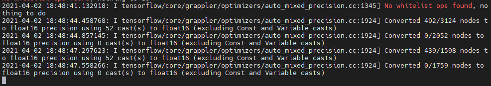 2021-04-02 15:51:22.374435: I tensorflow/core/grappler/optimizers/auto_mixed_precision.cc:1924] Converted 0/9362 nodes to float16 precision using 0 cast(s) to float16 (excluding Const and Variable casts)