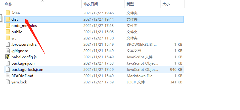 打包完成后项目路径下会生成一个新的文件夹dist,打包后的东西都在里面