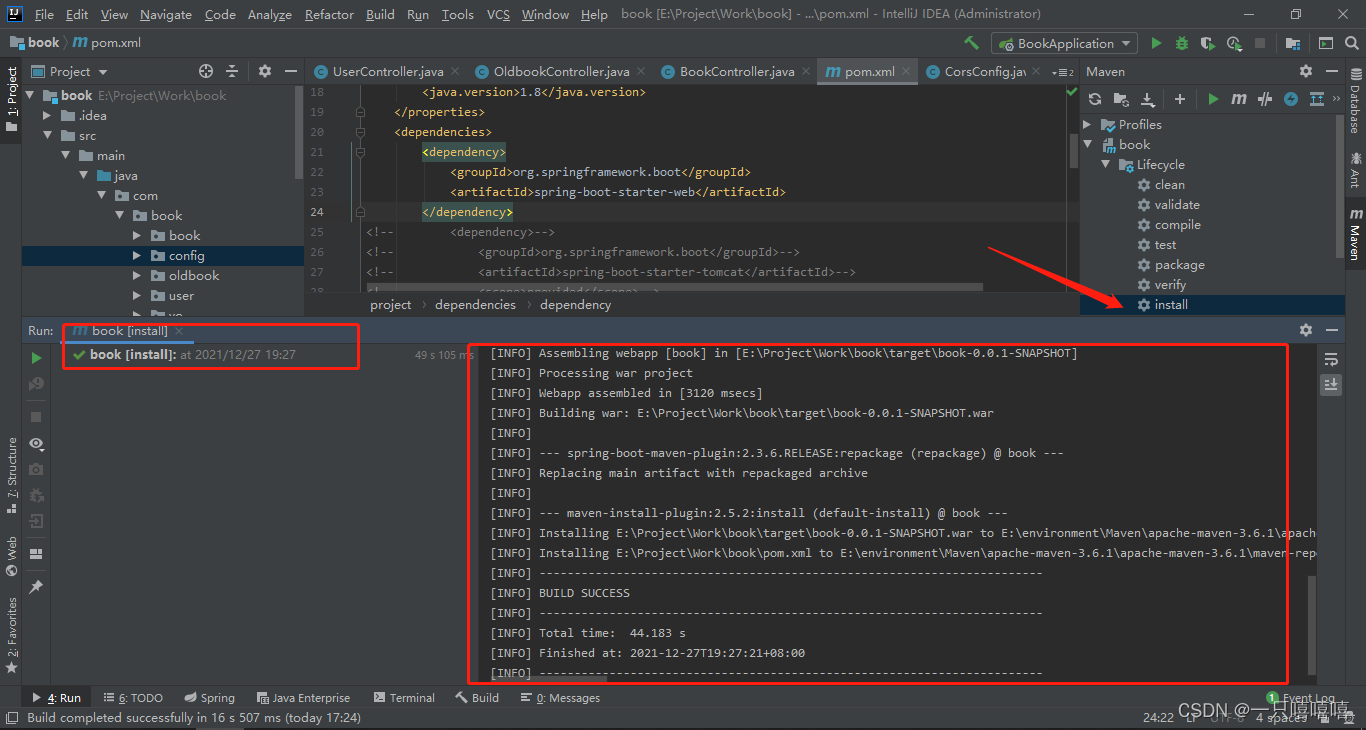 }接下来就是打包了,使用Maven快捷工具即点击install或用cmd命令打包,最后可以看到打包成功了