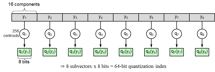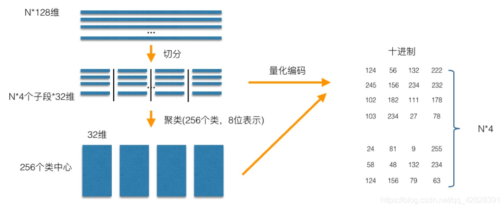 PQ先将D维空间切分成M份,现在考虑一个D=128维的原始向量,它被切分成了M=8个d=16维的短向量。