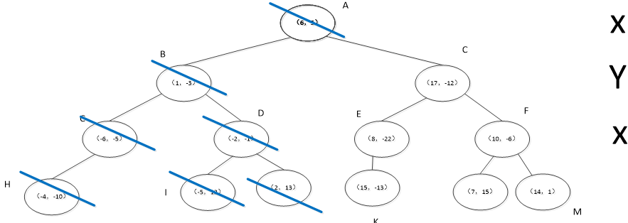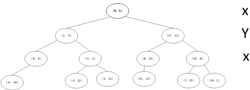 每次切分点为树的节点,最终构造的树结构如下,右侧的X和Y分别表示基于第一个维度和第二个维度进行切分。