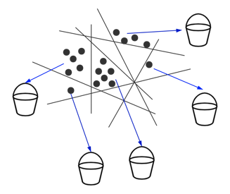 如果我们对原始数据进行一些hash映射后,我们希望原先相邻的两个数据能够被hash到相同的桶内,具有相同的桶号。取出该桶号对应桶内的所有数据,再进行线性匹配即可查找到与查询数据相邻的数据。