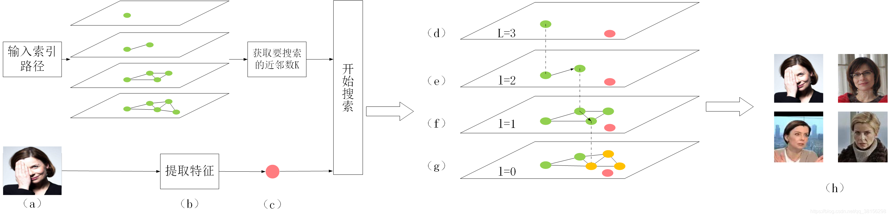 搜索时从最上层开始,找到本层距离目标最近的结点后作为下一层的入口,进入下一层再查找。如此迭代,快速逼近目标位置。