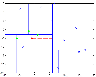 假设p节点为(-1,-5),在数据集中的位置如以下左图,检索邻近3个节点,经过上述搜索算法后,得到3个邻近节点(绿色节点),坐标为(-6,-5), (-1,-3), (-2,-1)。