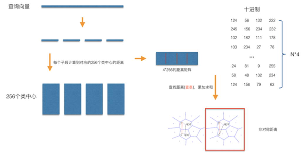 查找过程先将查找向量x进行分段,在每个子段计算x子段到对应256个聚类中心的距离,可以使用对称距离计算或非对称距离计算,计算结果存为256*4码本。然后在每段通过查询码本计算x与每个y的距离(用到所属聚类中心的距离近似计算),然后将每段计算的对应向量的结果累加求和,最后取topK向量。