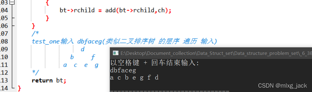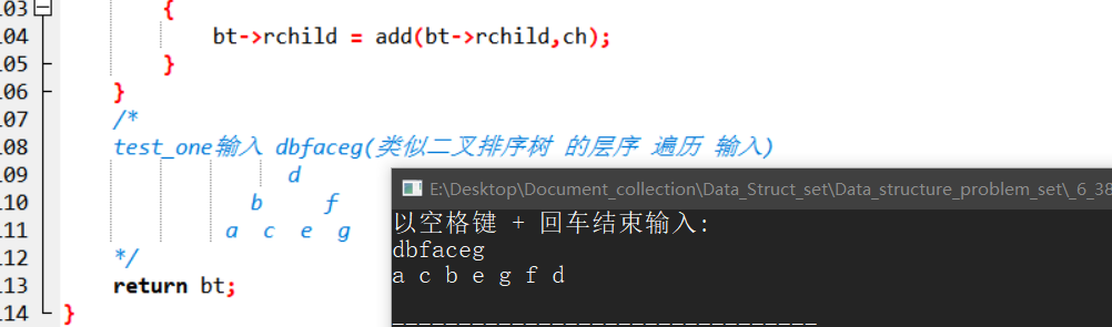 test_one输入 dbfaceg(类似二叉排序树 的层序 遍历 输入)