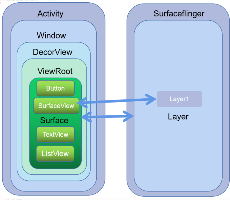 - 一个Window会对应一个surface,同时对应一个Layer, Window中所有界面元素共享一块surface, 在系统中WMS作为界面管理的主要服务,它会知晓所有Window的状态,并且对其进行控制,也就说对于大多数app而言,wms是他和SurfaceFlinger进行沟通的桥梁,但是surfaceview某种程度上可以“绕过”wms。SurfaceView拥有独立的surface。你可以控制这个Surface的格式,比如:大小;SurfaceView负责将Surface放置在屏幕上的正确位置 ,SurfaceView里面镶嵌的Surface是在包含SurfaceView的宿主窗口即:顶层视图对应的Surface后面;SurfaceView在其窗口中打一个孔这样它的Surface可以得到显示。这里说的“打孔”实际上只不过是在其宿主窗口上设置了一块透明区域,这样它的UI可以漏出来。SurfaceView的绘制方式比普通窗口高,因为SurfaceView的窗口刷新的时候不需要重绘应用程序的窗口,普通窗口的视图绘制机制是一层一层的,任何一个子元素刷新都会导致整个视图结构全部重绘一次