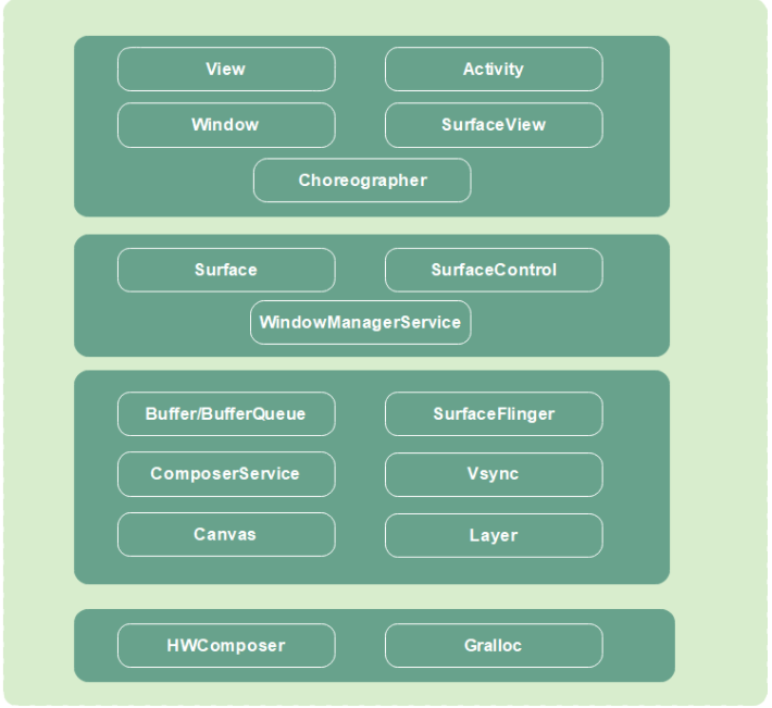 - SurfaceFlinger: 管理消费当前可见的 Surface,所有被渲染的可见 Surface 都被 SurfaceFlinger,通过 WindowManager 提供的信息合成,提交到屏幕的后缓冲区,等待屏幕的下一个Vsync信号到来,再显示到屏幕上。SufaceFlinger 在屏幕和上层之间起到了一个承上启下的作用。
