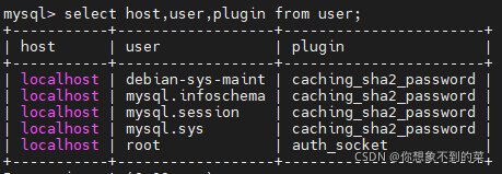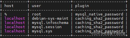 select host,user,plugin from user;
