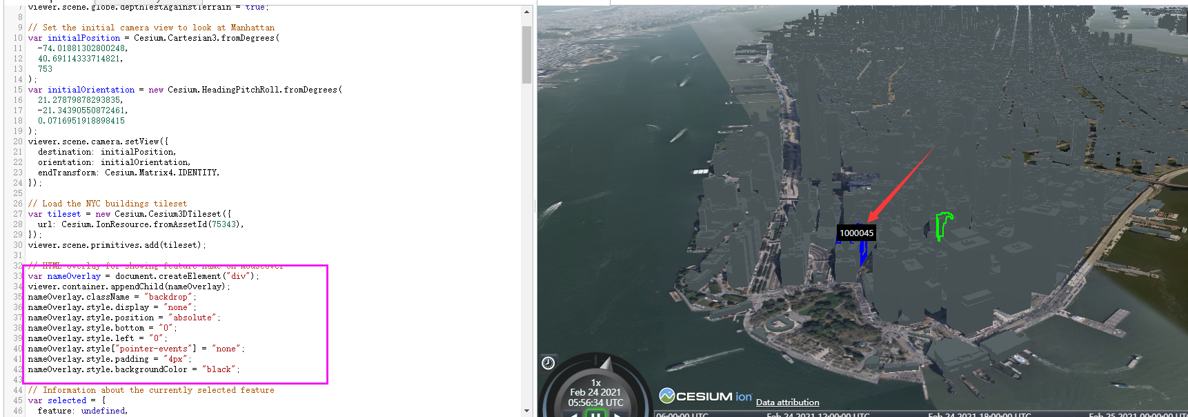 5、通过鼠标位置,去获取到鼠标位置上的Cesium3DTileFeature,再改变feature的颜色,从而看到鼠标移动的地方有高亮效果。