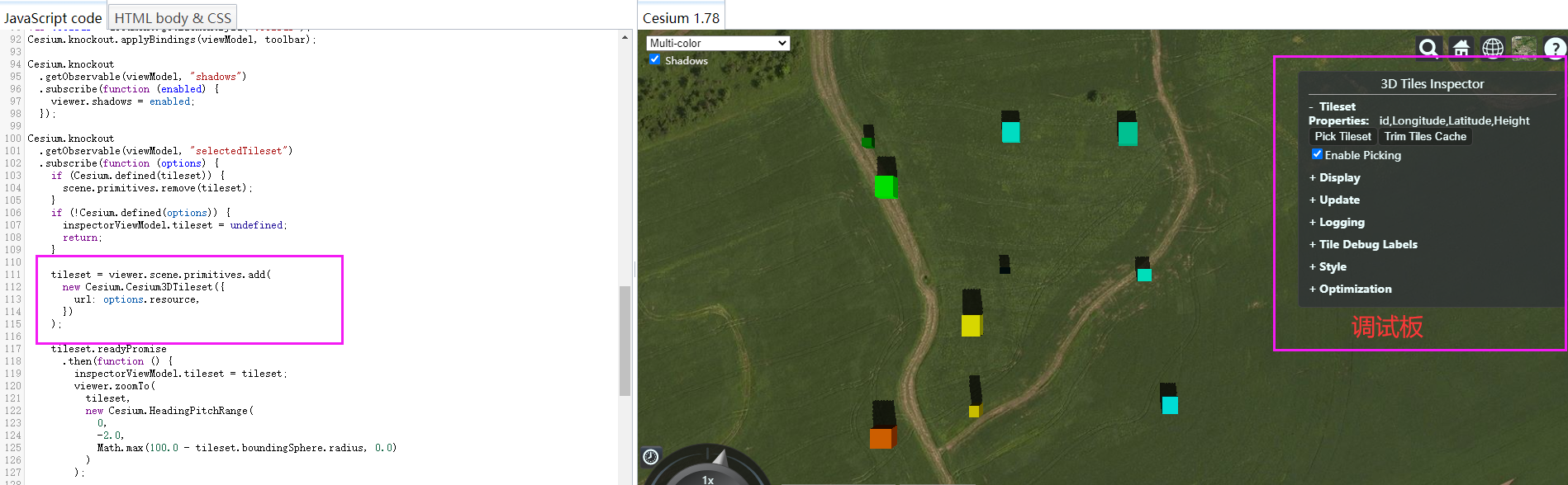 11、通过设置viewer.extend(Cesium.viewerCesium3DTilesInspectorMixin); 可以调试3dtilset(不同tile的颜色会不一样等)