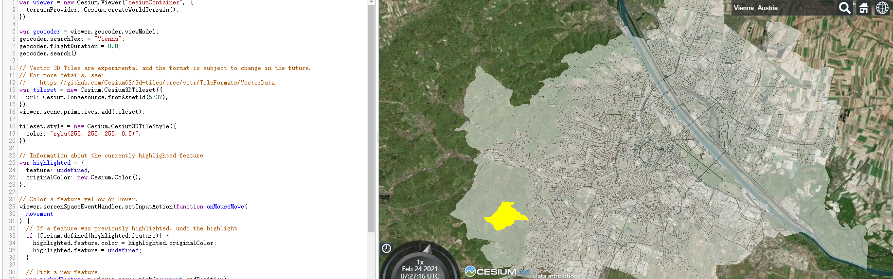 19、加载矢量面图层(tileset),鼠标移上去将获取到的feature改变颜色