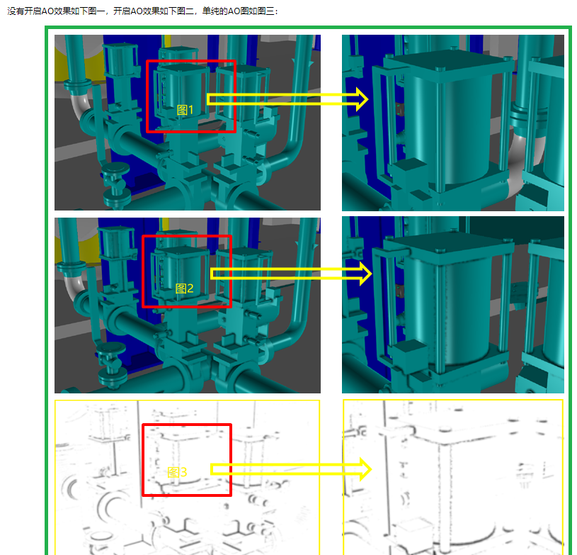 Ambient Occlusion简称AO,中文没有太确定的叫法,一般译作环境光遮蔽。百度百科上对AO的解释是这样的:AO是来描绘物体和物体相交或靠近的时候遮挡周围漫反射光线的效果,可以解决或改善漏光、飘和阴影不实等问题,解决或改善场景中缝隙、褶皱与墙角、角线以及细小物体等的表现不清晰问题,综合改善细节尤其是暗部阴影,增强空间的层次感、真实感,同时加强和改善画面明暗对比,增强画面的艺术性。AO简单来说就是根据周围物体对光线的遮挡程度,改变明暗效果。AO具体理论原理在网上都可以找到,感兴趣的可以去查阅。
