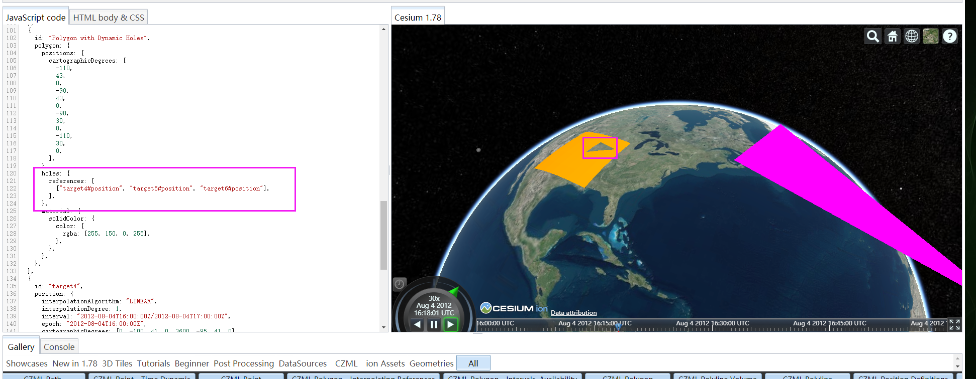 39、使用czml的方式画多边形并随始终变化而变化颜色位置和画一个带有洞的多边形